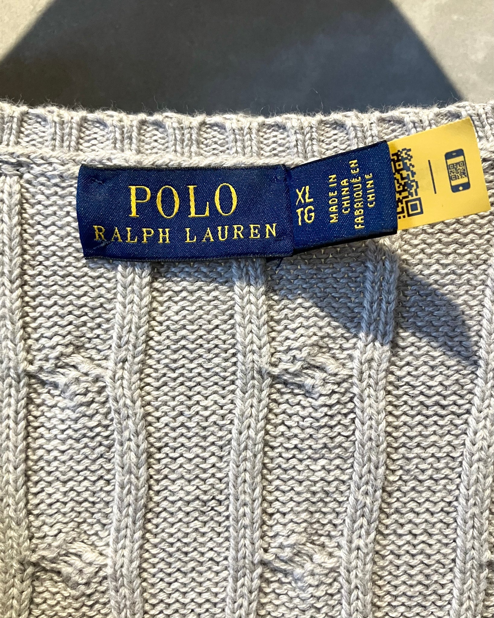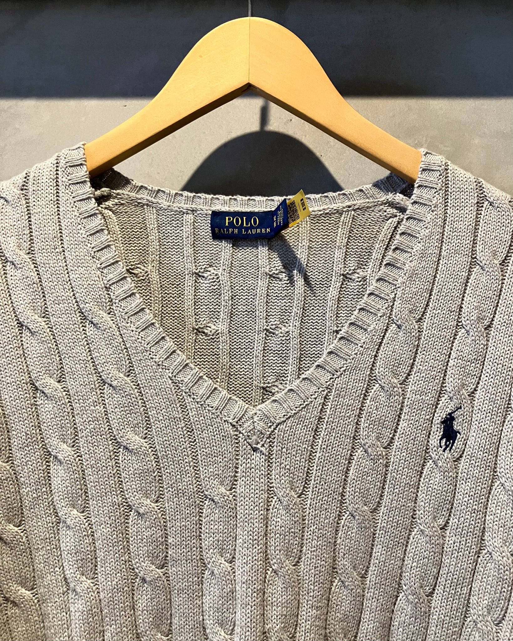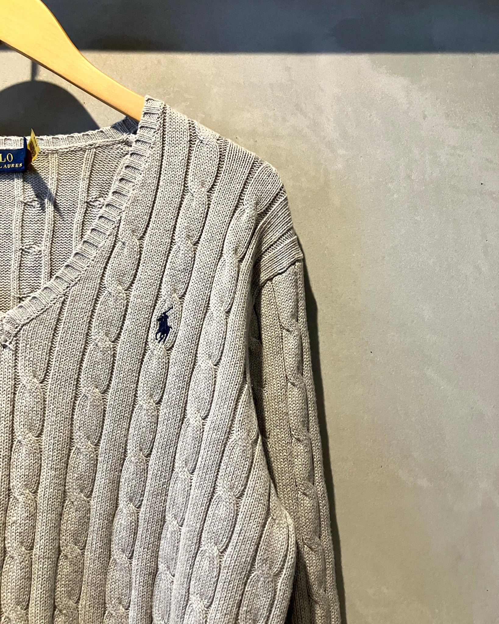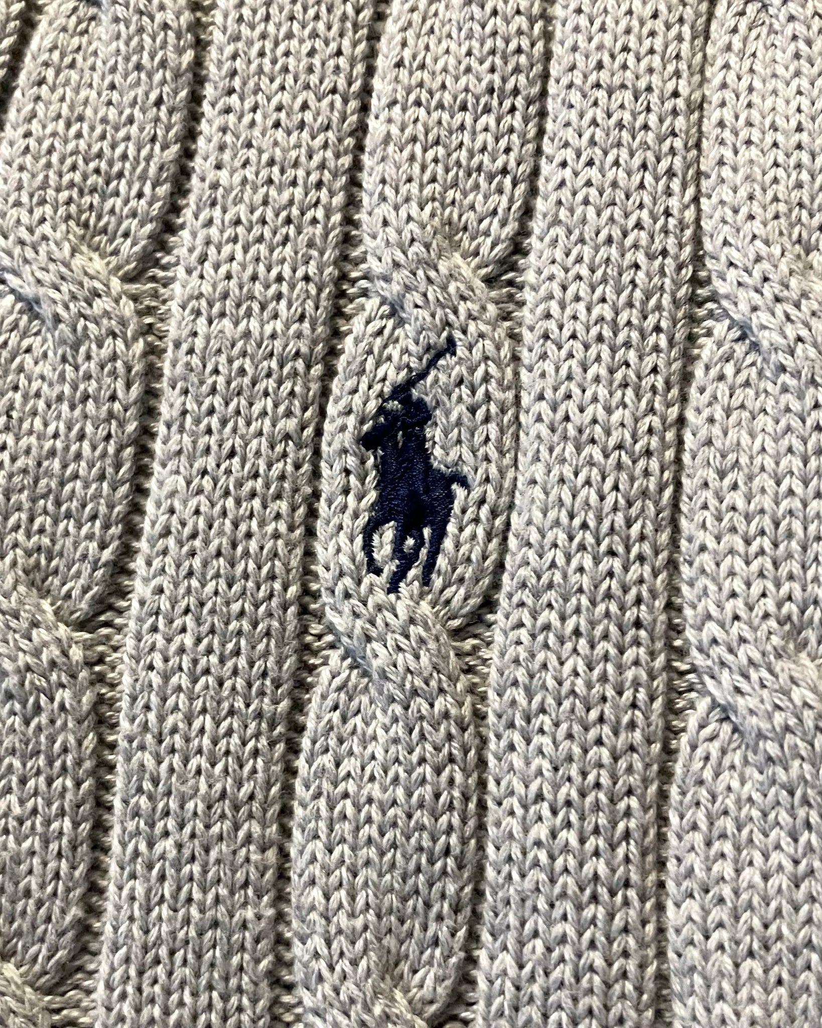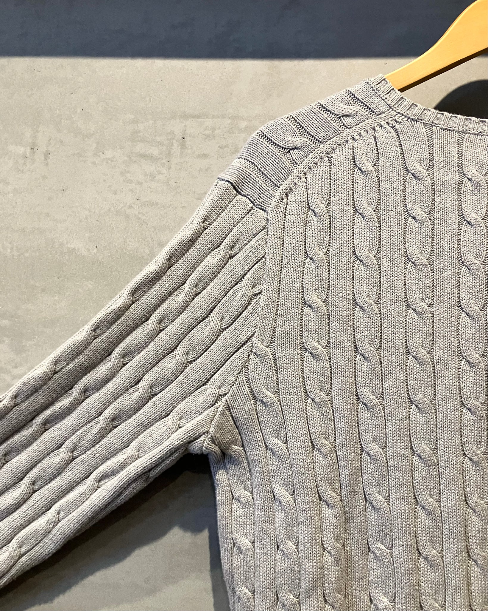 明るめのグレーのハッキリとしたケーブル編み、